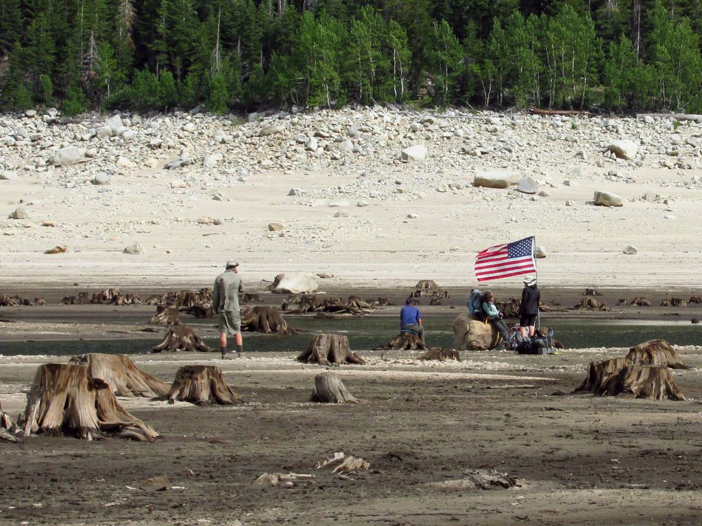 Ferry landing for Lake Vermilion Resort. Lake Thomas A Edison, a reservoir, was so low that decades old stumps were exposed, and a mile hike over mudflats was required to reach a spot where a small skiff could land. The resort caters to hikers and is a JMT resupply point. They offer a free beer and a tentsite to all thru-hikers. That, and the lure of a home-cooked meal, was too hard to pass up.