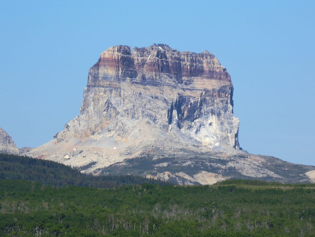 We first detour to view spectacular Chief Mountain, a world renowned example of a klippe. The Lewis Thrust, exposed at the slope break near talus line, is a 170 million year old thrust fault that carried Proterozoic rocks several miles thick, and hundreds of miles wide, over 50 miles (80 km) horizontally over much younger Cretaceous rocks. It is a humbling testament to the inexorable power of the Earth's tectonic forces.